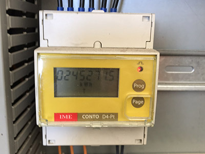 Energimätare med display för visning av energi, effekt, ström med mera. Se också av energiåtgång per bal i HMI/displayen på balpressen.